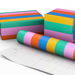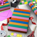 - Striped wrapping paper with wide bands of green, pink, red, blue and yellow.