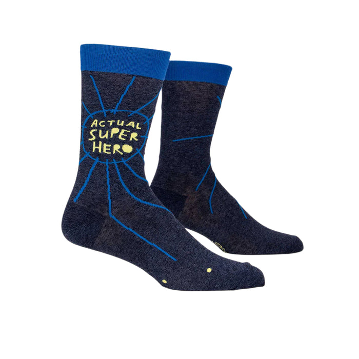 It's a bird! it's a plane! It's a... Regular person doing incredible things! These Blue Q Menās Crew Socks ā "Actual Super Hero" celebrate the accomplishments of the everyday person, achieving amazing things on a daily basis.
