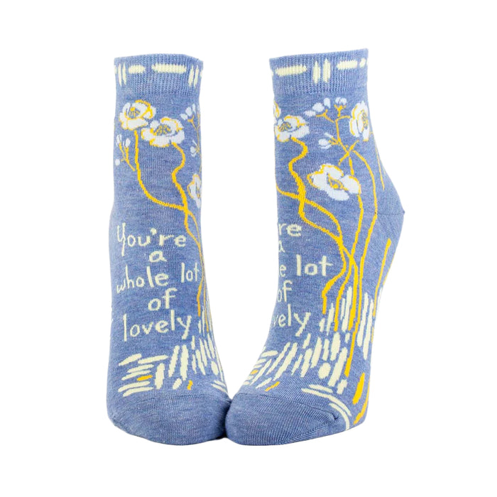 The perfect gift for those moments when you burst through the walls of just plain Lovely and strike a perfect landing smack-dab in the middle of A Whole Lotta. The Blue Q Women's Ankle Socks ā "You're a Whole Lotta Lovely" help gracefully compliment your beauty.