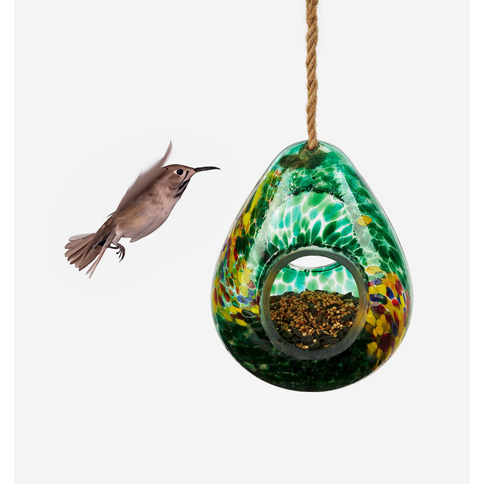 A decorative accent for your outdoor oasis and a rest stop for hungry fliers, this beautifully styled Pear Shaped Glass Birdfeeder is open on both sides to allow easy filling and feeding for the birds. Features a hanging blown glass teardrop design in vibrant green and yellow hues and comes with a hemp rope hanger. Glass, Hemp Rope.