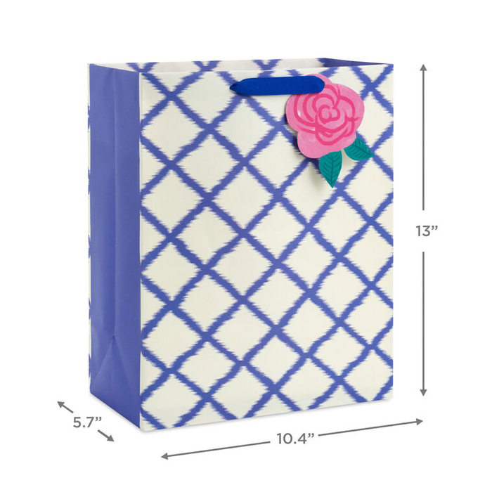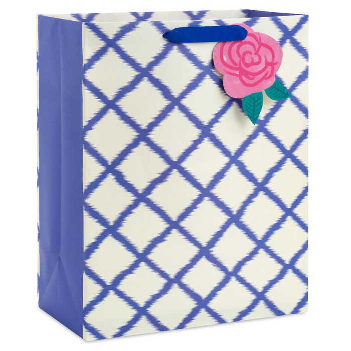 Bring geometric beauty to your gift with this elegant gift bag's diamond design and pink rose accent tag. Large gift bag features a blue trellis pattern on a white, linen-textured background. Perfect for birthday, Mother's Day, bridal shower or graduation. Includes die-cut pink rose gift tag.