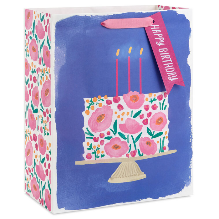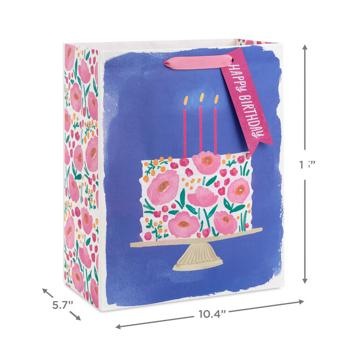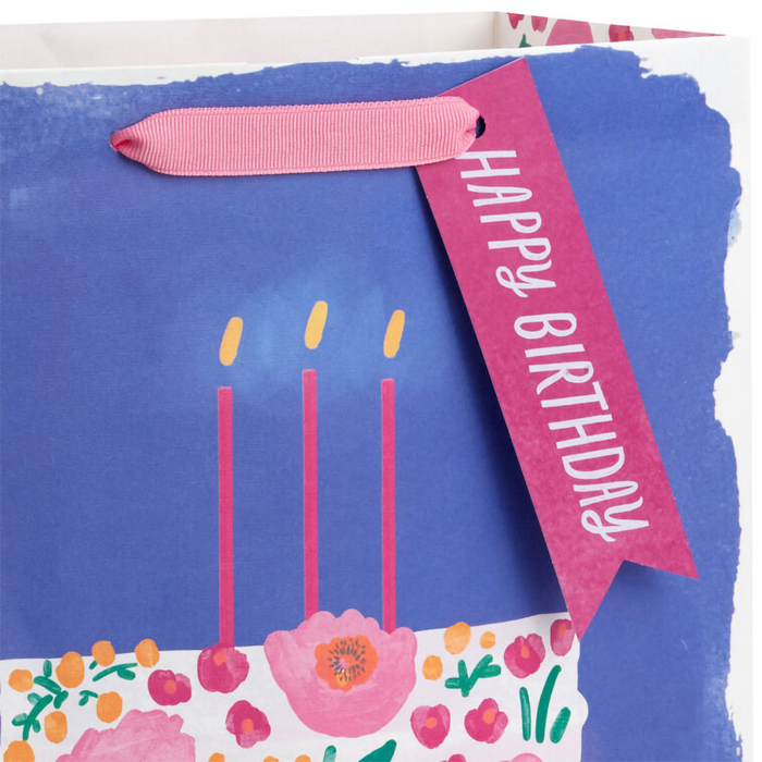 Sweeten the gift treatment with the floral beauty brought on by this charming bag. Large bag features a birthday cake with pink flowers and tall candles on a cake stand with a blue, linen-texture background. Vibrant gift bag is perfect for mom, grandma, sister, daughter, aunt, cousin, friend or loved one. Bag includes a die-cut gift tag.
