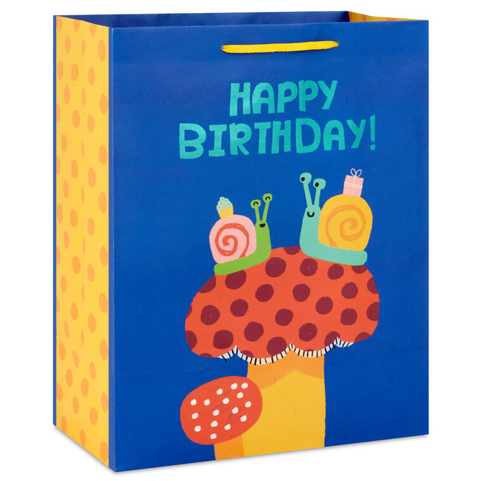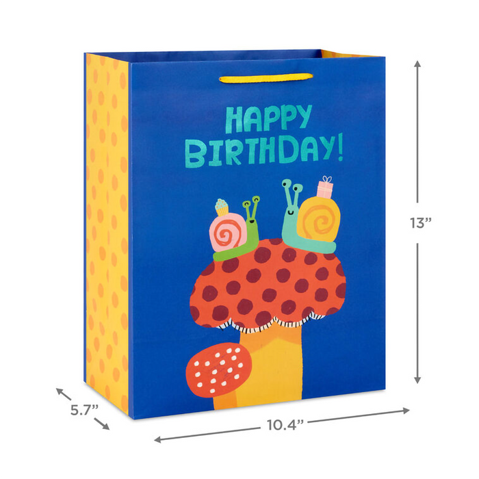 Win the day with these party-ready snails and their mushroom habitat. Large birthday gift bag features a whimsical illustration of two snails settled on a red, polka-dot mushroom. Turquoise foil lettering, a bright blue background and linen-textured finish add to the fun. Whimsical gift bag makes a great choice for kids, teens, tweens, friends and family.