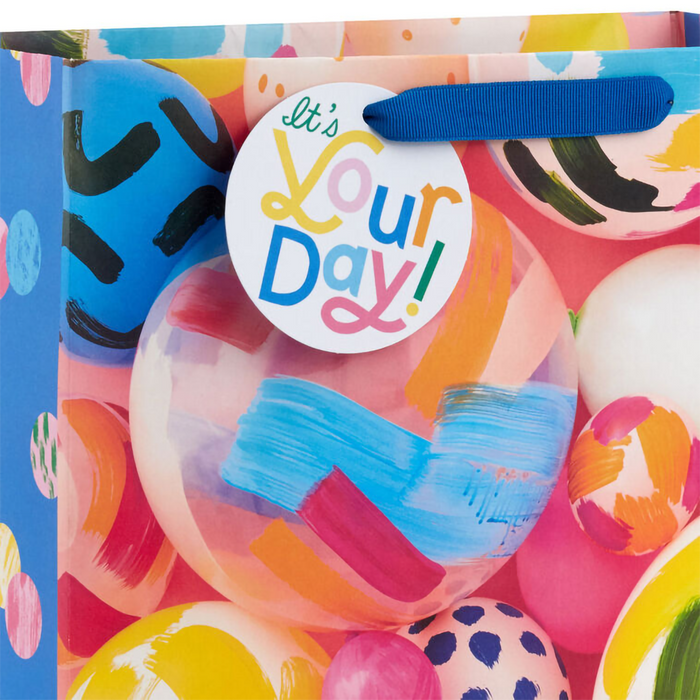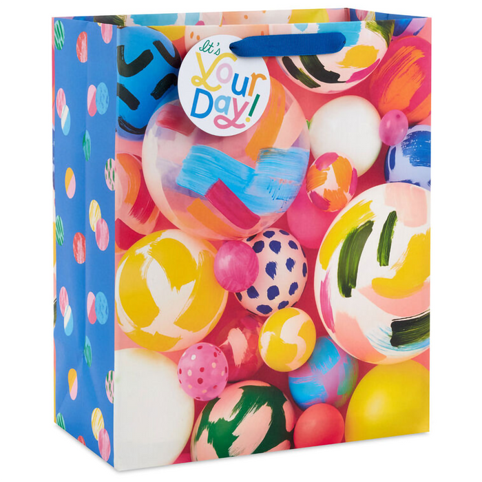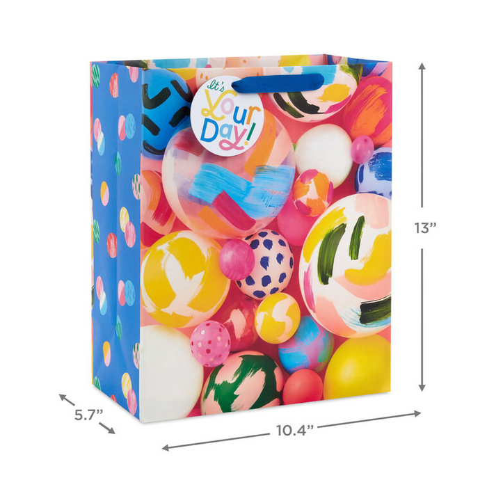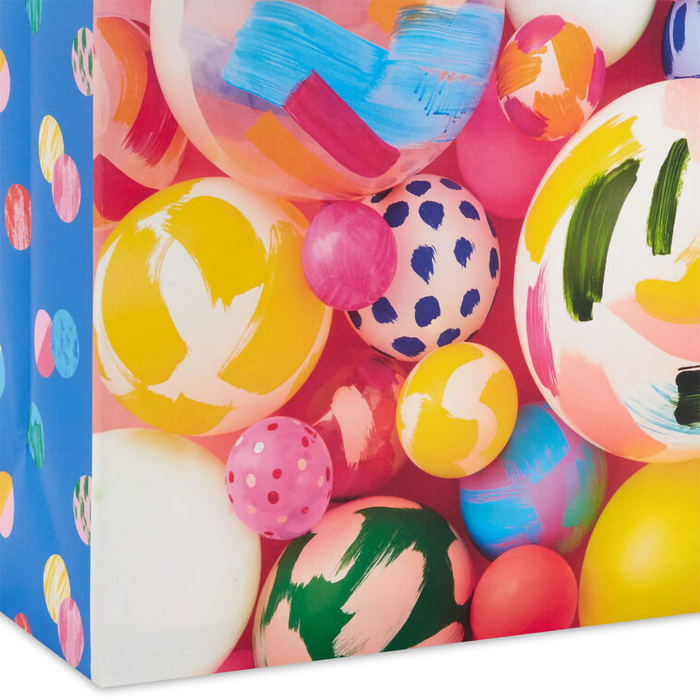 Have a ball with this cute gift bag that adds oomph to any celebration with its colorful, playful design. Large gift bag features a close-up photograph of a collection of colorfully painted, round balloons. On the gussets, overlapping dot designs on blue add to the fun. Multicolor gift bag makes a great choice for birthday or graduation. Bag includes a round gift tag with multicolor lettering.