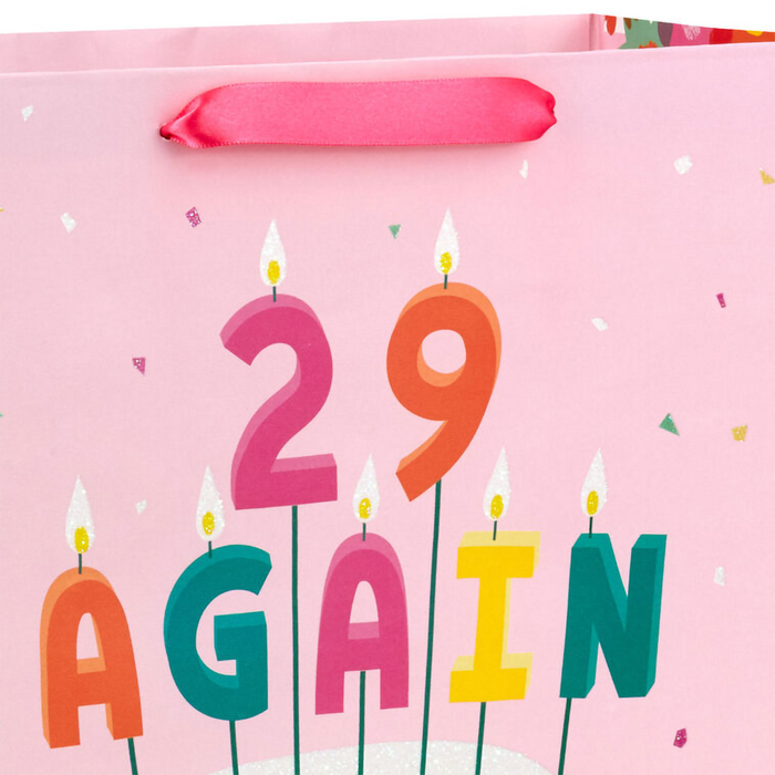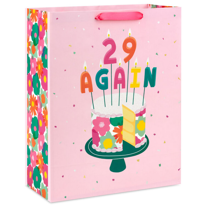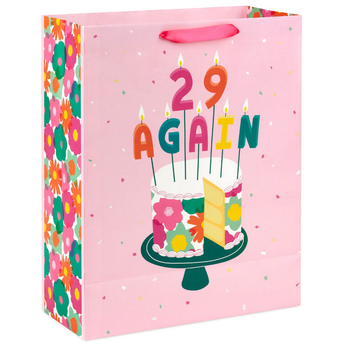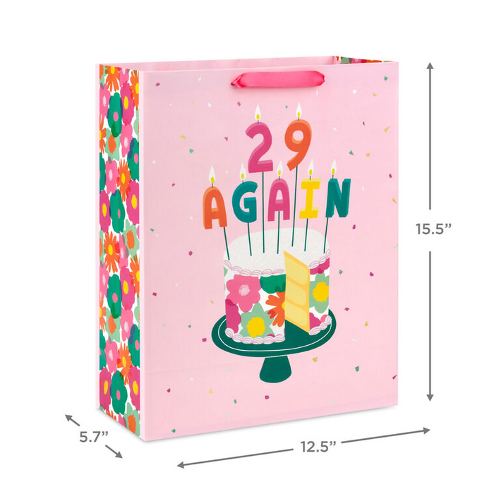 Remind them no one needs to know their real age with this oversized "29 again" birthday gift bag and its stylish cake and flowers design. Birthday gift bag features a pretty cake with flower icing and letter candles on a pink background with glitter and embossing. Makes a great choice for a birthday girl celebrating turning age 30 or better.