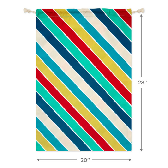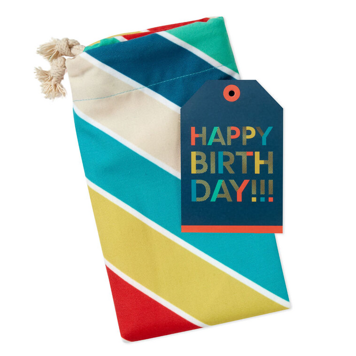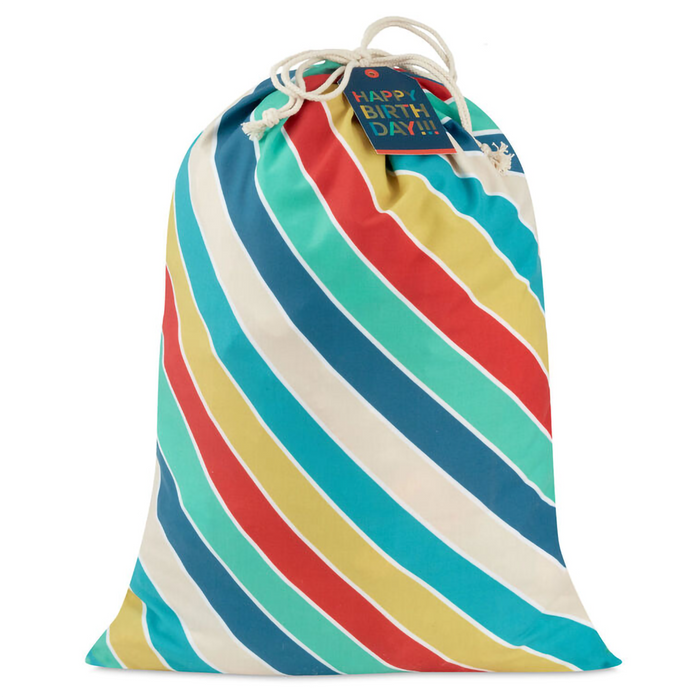 Update your gift-giving game with this boldly beautiful birthday gift bag in a fabric pattern that's sure to catch their eye. Canvas sack gift bag features wide diagonal stripes in muted shades of blue, green, red and yellow with narrow lines of gold between them. Perfect for birthday boys and girls of any age. Includes gift tag with gold metallic ink accents and drawstring closure.