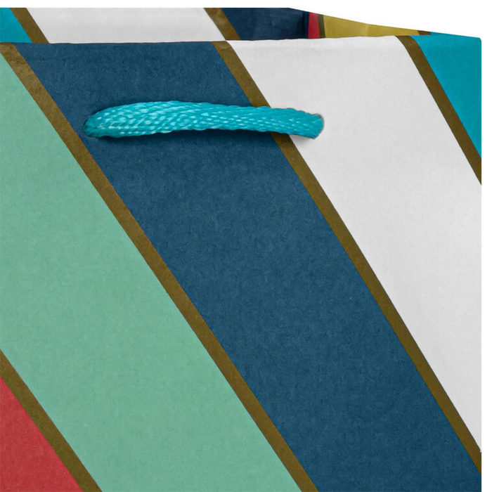 Wrap up a birthday, graduation or special occasion gift in traditional style with this polished gift bag. Small gift bag features wide diagonal stripes in muted shades of blue, green, red and yellow with narrow lines of gold between them. Striped bag is perfect for his birthday, Father's Day, graduations and other dressed-up occasions.