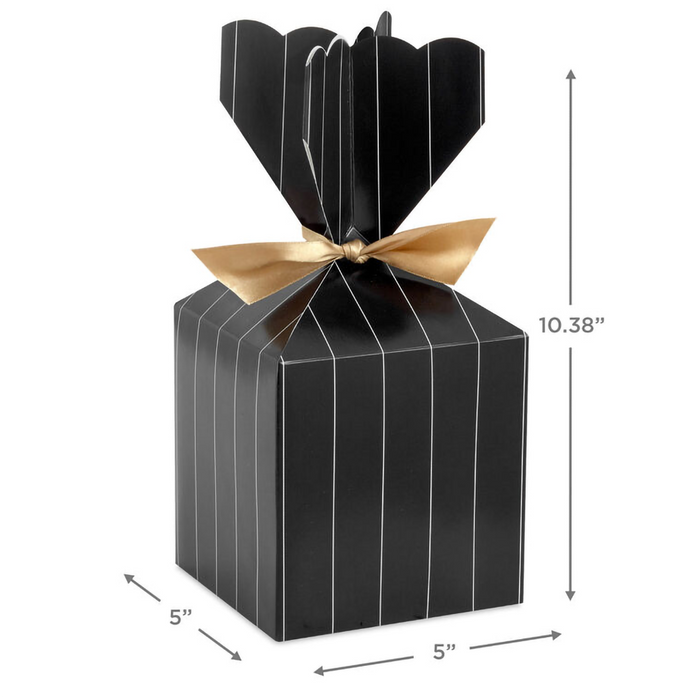 Dress up any gift for a fancy occasion with this glamorous, stand-up gift box. Vertical treat box features gold pinstripes on a black background and a scalloped top edge. Hallmark treat box is a great way to dress up wrapped homemade goodies for fancy parties, wedding receptions, retirements and more. Box includes a gold ribbon tie to secure it closed.