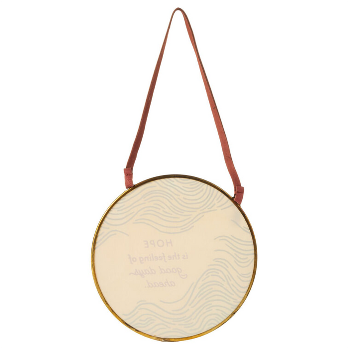Keep hope forever brimming in your soul with this pretty, decorative mantra hanging in your home. This elegant round glass plaque features line illustrations of blue waves paired with an inspirational message in pink lettering. Encircled in a gold metal frame, the decoration includes a faux leather cord for hanging and makes a lovely accent on a wall in your kitchen, family room or home office. Our hanging glass decoration makes a sweet gift of support and encouragement.