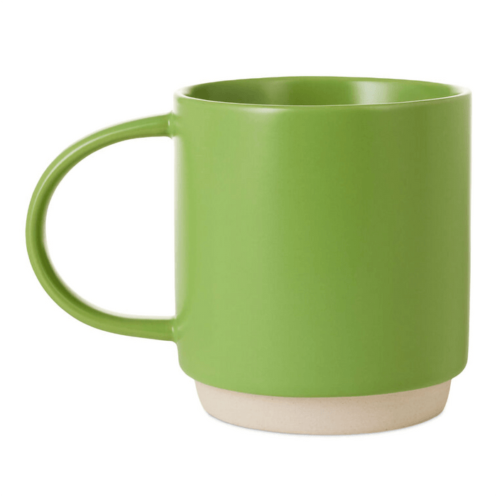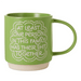 - Bright green mug features a snarky message in whimsical white lettering, an oversized handle and a recessed base for stacking.