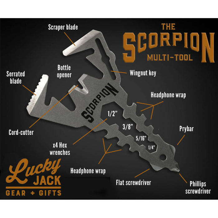 Always be prepared for anything with Lucky Jack's Scorpion Multitool. This multitool comes with all the essentials for any quick jobs such as a flathead and Phillips head screwdrivers, versatile hex wrenches, and wingnut key. All in a compact form so that you can carry it wherever you go for any DYI projects, camping, or everyday carry.
