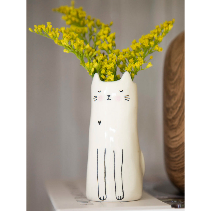For those who love cats, we designed this cat-shaped bud vase to add to your collection! Place floral stems in this 3" (H) ceramic vase and display it on a small shelf, mantle, windowsill, or end table. It comes with decorated with an adorable cat face, front paws, a heart detail on the front, and a subtle tail on the back. Grab an extra as a home decor gift for your fellow cat-loving friend!