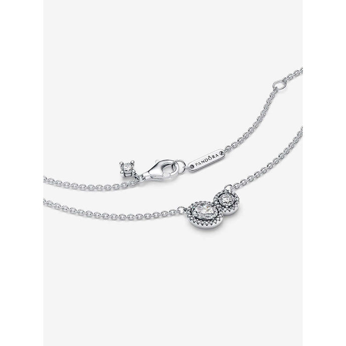 Embrace the power of two with Pandora Embracing Halo Necklace. This necklace features two sparkling stones, one round and one oval connected by a pavé halo. An additional stone dangles near the necklace's clasp.