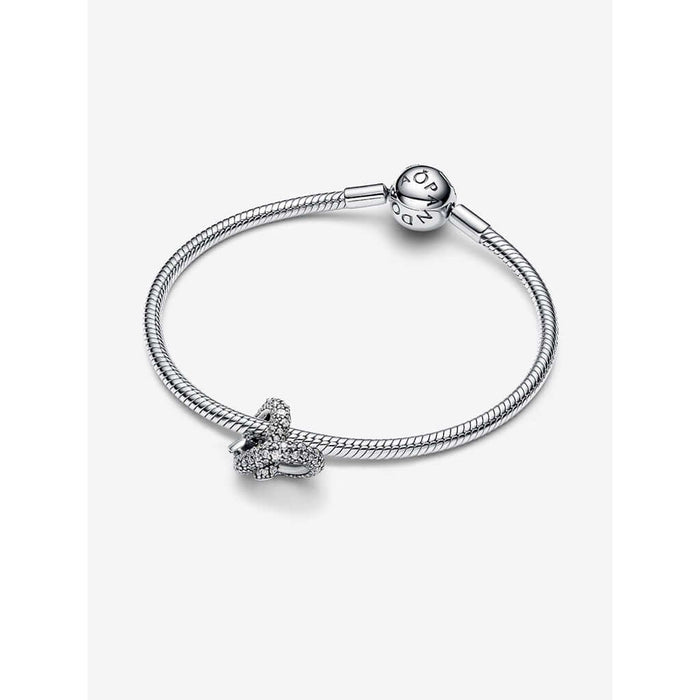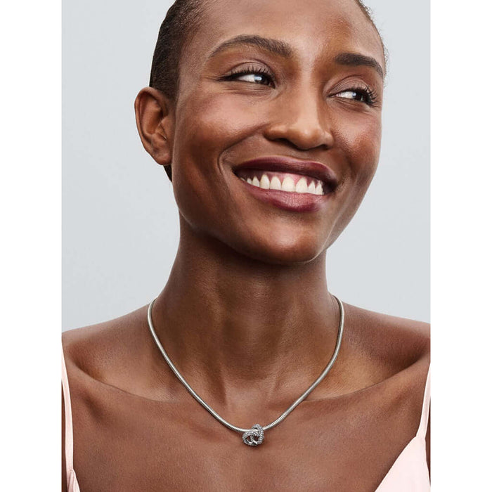 Add three-dimensional sparkle to your look with Pandora Pavé Infinity Knot Heart Charm. Features a knotted heart covered with pavé detailing. Inspired by everlasting love and interconnectedness, this charm brings as much meaning to your day as it does boldness to your look, with its structured, textural design. Pull your favorite snake chain bracelet or necklace through one of the loops to complete your perfect look.
